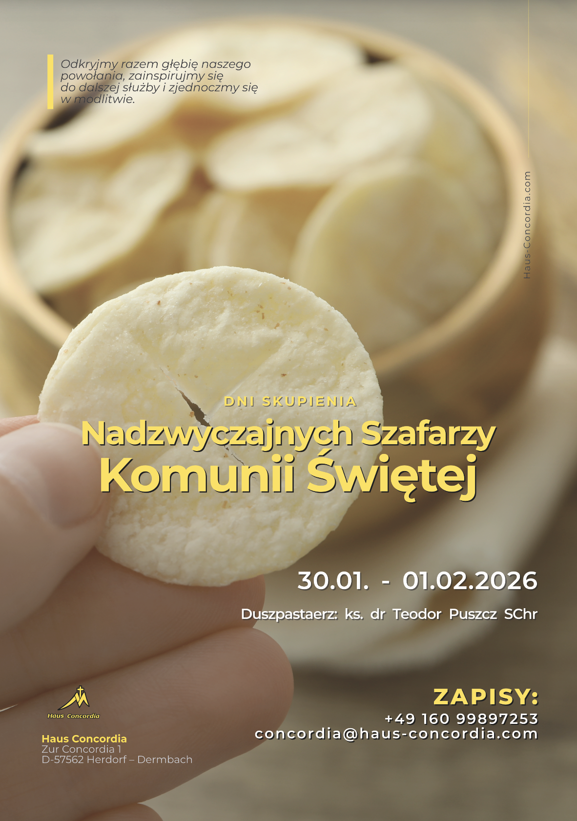 Zapraszamy na wyjątkowe dni skupienia przeznaczone dla Nadzwyczajnych Szafarzy Komunii Świętej. To czas zatrzymania się, pogłębienia duchowości oraz odnowienia w sobie sensu posługi, którą każdy z Was niesie do parafii, wspólnot i osób chorych. W atmosferze ciszy, modlitwy i serdecznej wspólnoty odkryjemy na nowo głębię naszego powołania. Będzie to przestrzeń na refleksję, rozmowę z duszpasterzem...