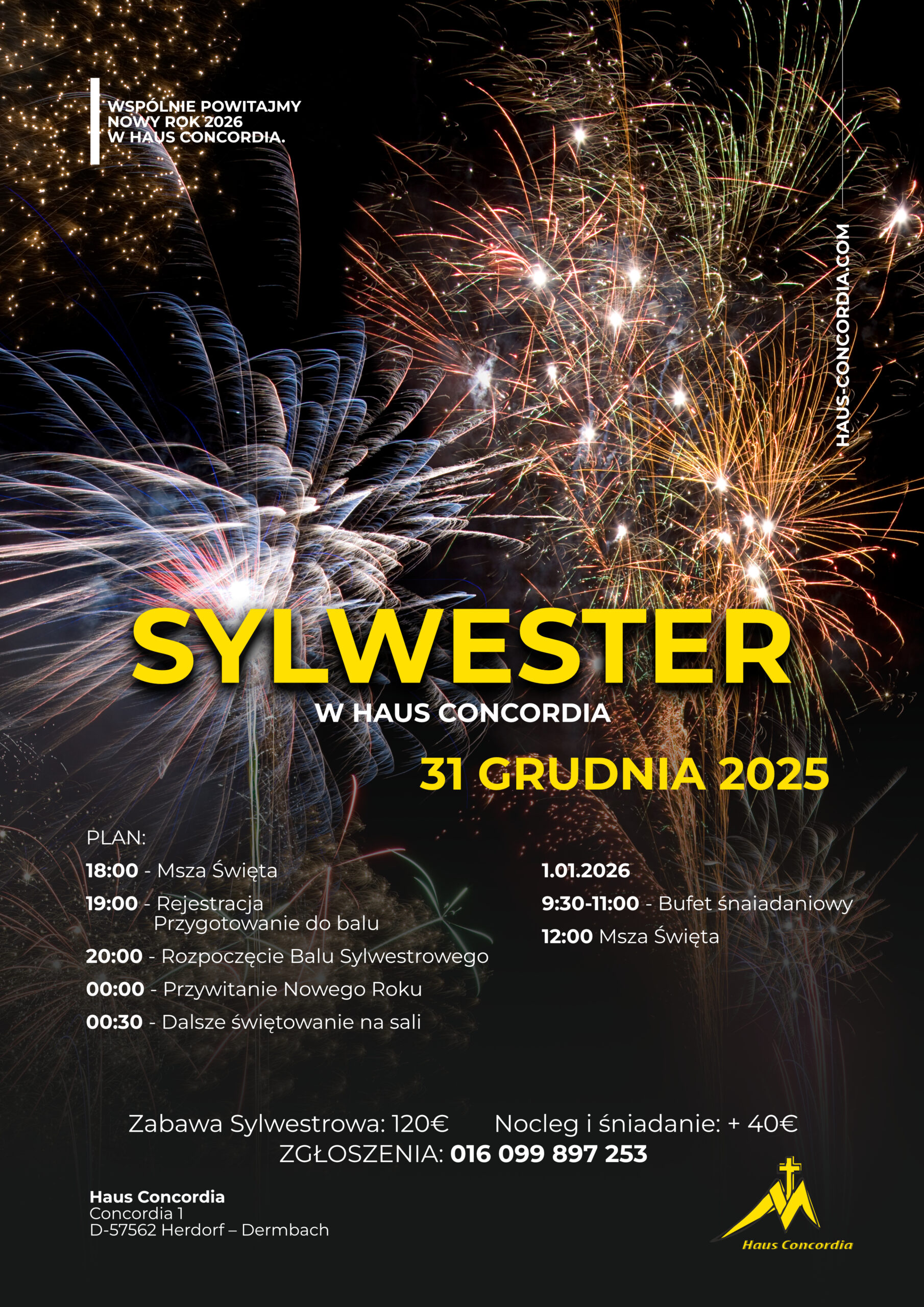 Zapraszamy do spędzenia wyjątkowej nocy sylwestrowej w Haus Concordia. W kameralnej, rodzinnej atmosferze, z dala od zgiełku miasta, przywitajmy razem Nowy Rok 2026 - z dobrym jedzeniem, tańcem i czasem na zatrzymanie się przy wspólnej modlitwie. Program wieczoru - 31 grudnia 2025 18:00 – Msza Święta19:00 – Rejestracja uczestników, przygotowanie do balu20:00 – Rozpoczęcie Balu Sylwestrowego00:00 – Powitanie Nowego...