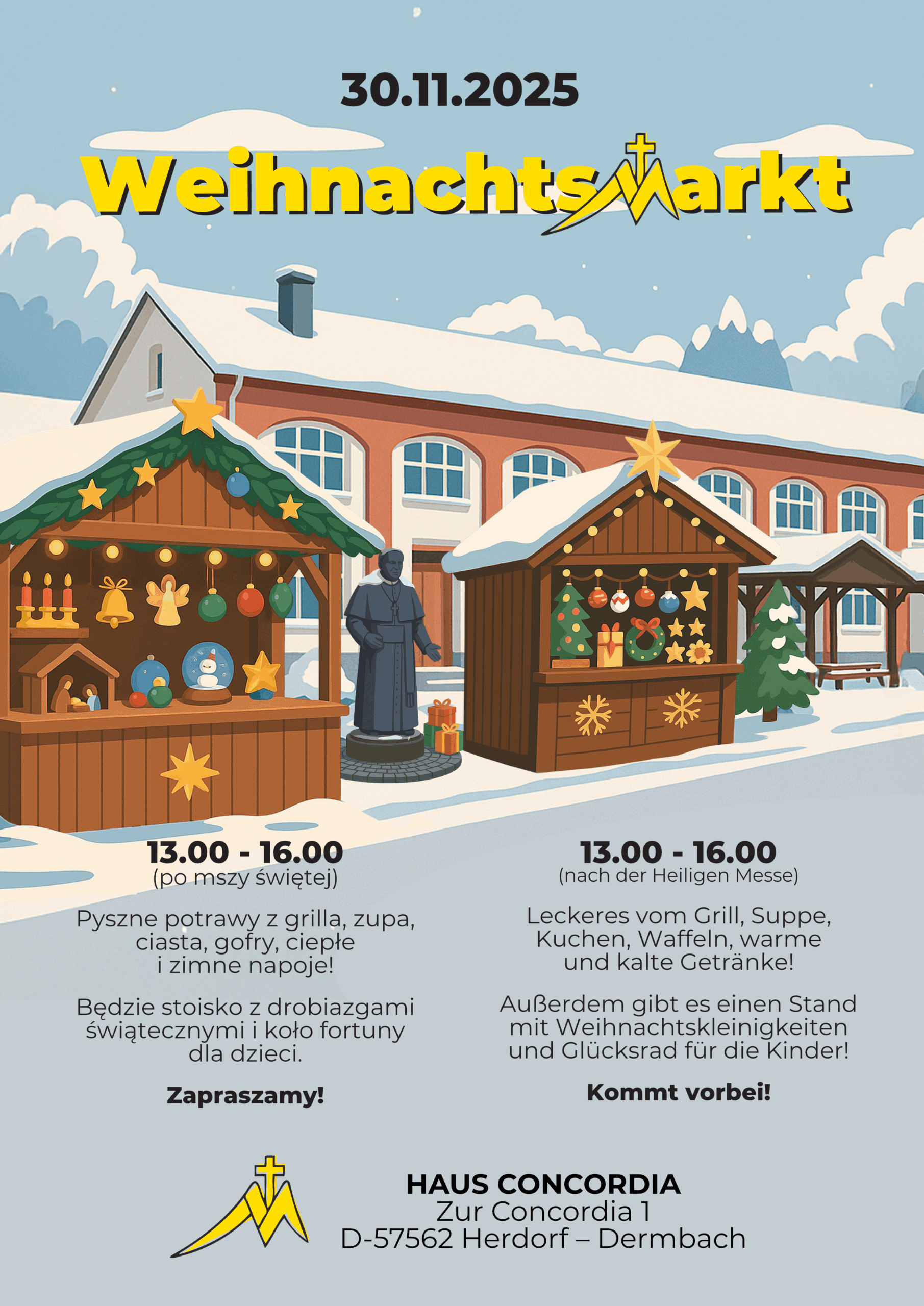 Zapraszamy na rodzinny, pełen ciepła Świąteczny Jarmark w Haus Concordia!To piękne popołudnie po mszy świętej, podczas którego wspólnie poczujemy atmosferę nadchodzących Świąt Bożego Narodzenia - wśród zapachu grilla, domowych wypieków i radosnych rozmów. Co na Państwa czeka? 🌭 Pyszne jedzenie– potrawy z grilla– zupa na rozgrzanie– ciasta i słodkości– gofry– ciepłe i zimne napoje 🎄 Świąteczne stoiskoDrobiazgi, dekoracje...