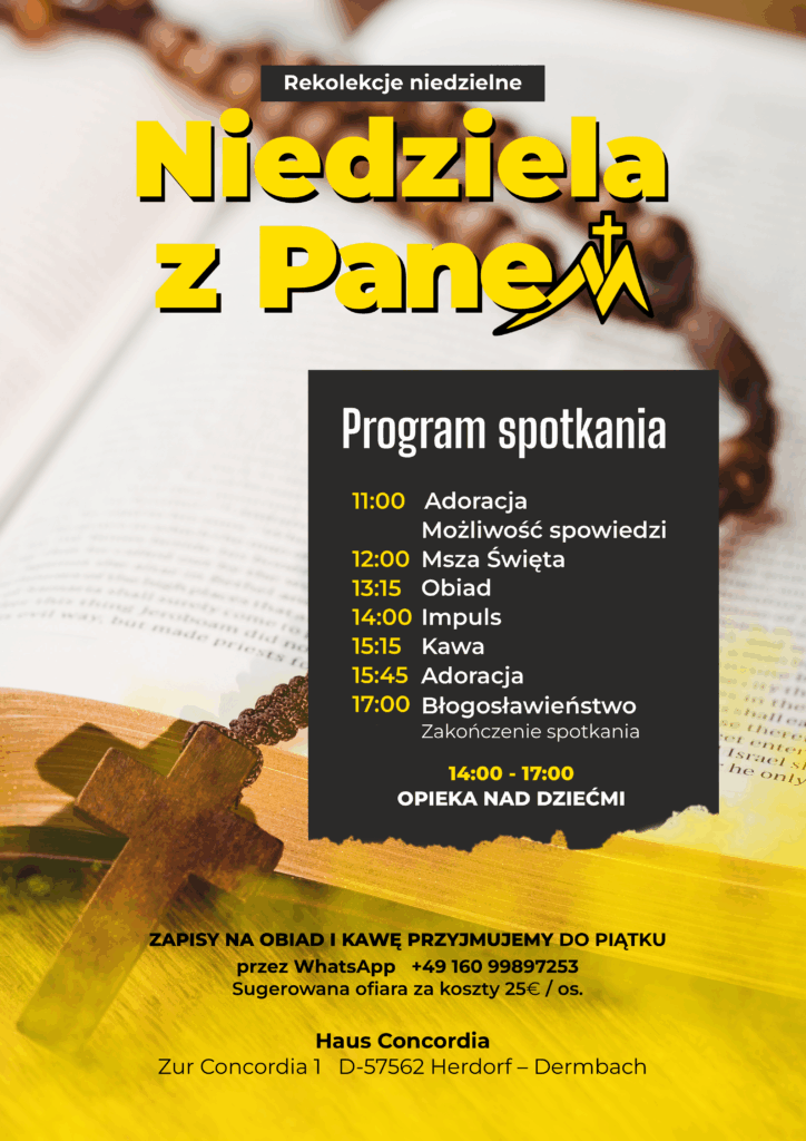 W godzinach 14:00–17:00 zapewniamy opiekę nad dziećmi, aby rodzice mogli spokojnie uczestniczyć w rekolekcjach.